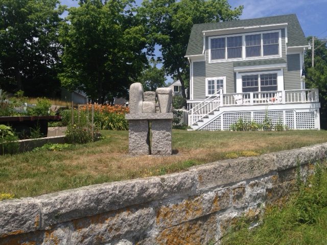 The idea of placing Roy Patterson’s sculpture on that site grew on me gradually as I passed by it year after year, season after season, sitting there in the dooryard of the Turtle Gallery in Deer Isle. I never really decided to; it just seemed more and more obvious that the piece would fit perfectly there. It is solid and familiar, built of the very granite blocks and shapes that all the walls up and down School Street are built of, including the one it sits atop. So it dialogues well with the natural world here, and with our local history and heritage. But it has another level of meaning as well, much more subtle, allusive and archetypal.