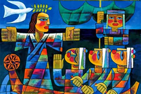Images from the top: Cover of The Wisdom Jesus, courtesy of Northeast Wisdom; Icon of St. Theophan the Recluse, Copyright © 2014 Orthodox Christian Supply. All rights reserved, courtesy of their website; Solomon Raj, “Jesus on the Lotus Flower” (1998), copyright credit to Solomon Raj, courtesy of the New York Times; First page of Gospel of Thomas Codex II, public domain, courtesy of Wikipedia; The Chinese-born artist James He Qi’s “Peace, Be Still” (1998), copyright credit to James He Qi, courtesy of the New York Times.