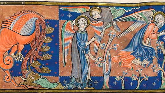 Illuminations are from the Trinity Apocalypse, c. 1250, Trinity College, Cambridge. R.16.2 – The James Catalogue of Western Manuscripts