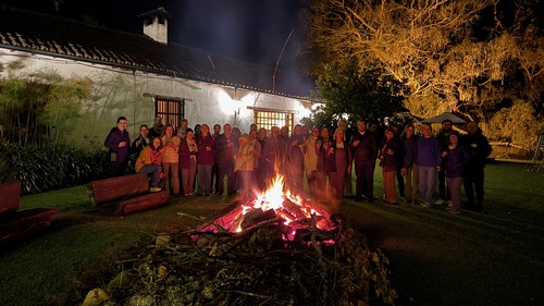 Carmen Horst and her sister Emily (Argentina) composed or adapted thematically accompanying chants. Josefina Fernandez (Venezuela) offered morning yoga. A Catholic priest immersed in Zen practice who leads the Colombian branch of the Society of Urban Monks (urban-monk.org) led us in a chant on the four elements that dovetailed with a guided meditation of Sufi/Buddhist origin on five elements. We were, as Cynthia asked us to do—seeking solidarity with creation. Below is a photo of a magnificent lightning-struck eucalyptus that with human assistance still stands and also of the tree illuminated by a bonfire at night, The school ended with Teilhard de Chardin’s Mass on the World.