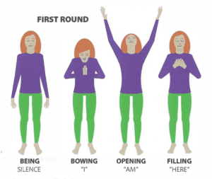 This body prayer begins by grounding the being in wholeness and incorporates the three universal gestures of creation: bowing, opening, and filling. Instructions for the prayer sequence are outlined here.